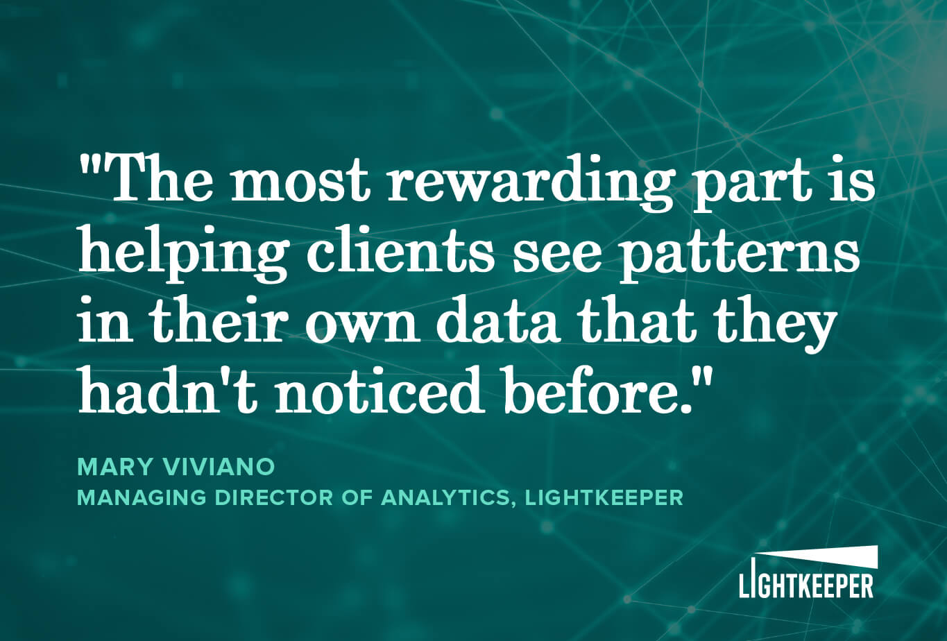 Greg Johnson, Senior Managing Director, Client Solutions of Lightkeeper, puts it this way: “She doesn’t just build analytics, she works closely with clients to understand their challenges and helps them apply the insights in meaningful ways.”